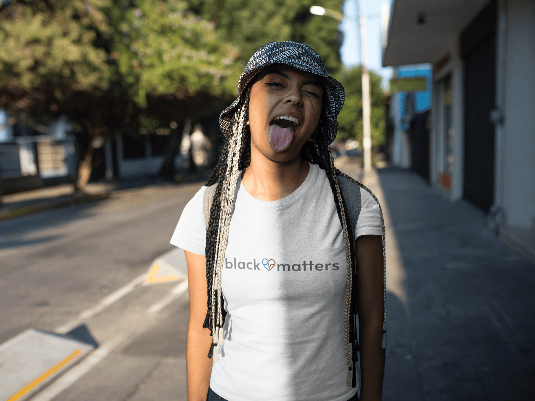 Black woman wearing a Black Love Matters shirt outdoors in a street setting