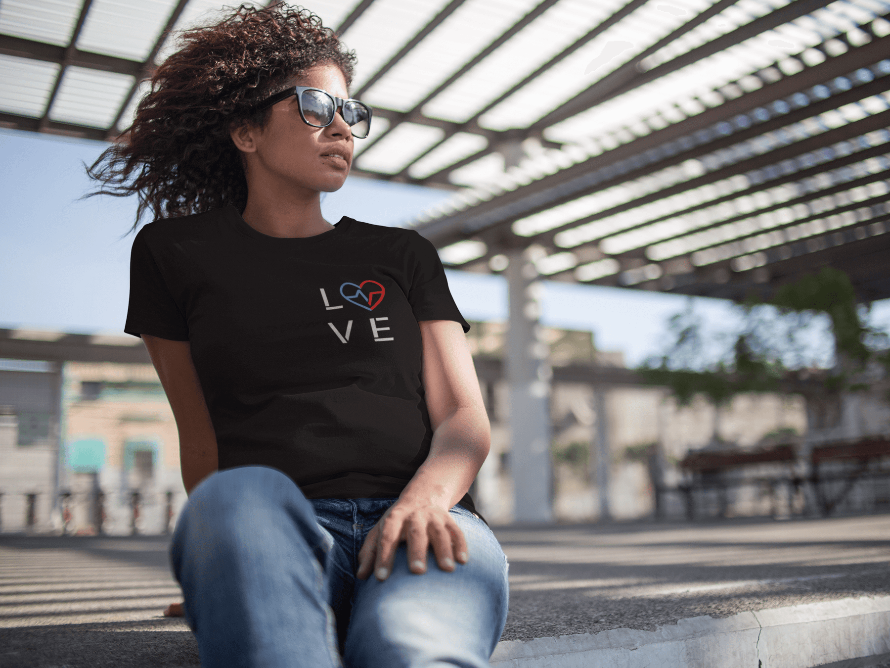 Black woman wearing the black Love Season tee with the red and blue heart emblem while sitting outdoors in sunlight.
