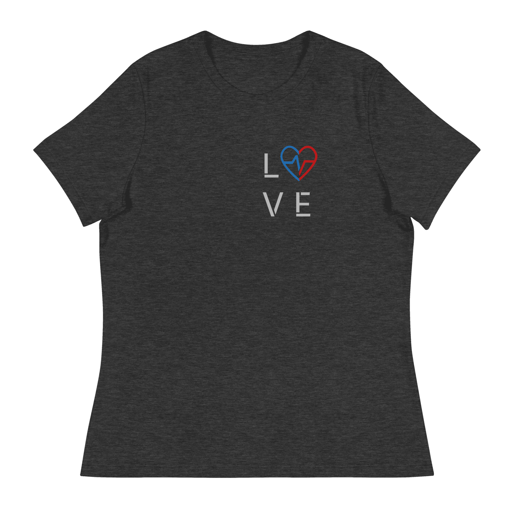 Dark heather women’s Love Season tee with the red and blue heart emblem centered on the chest.