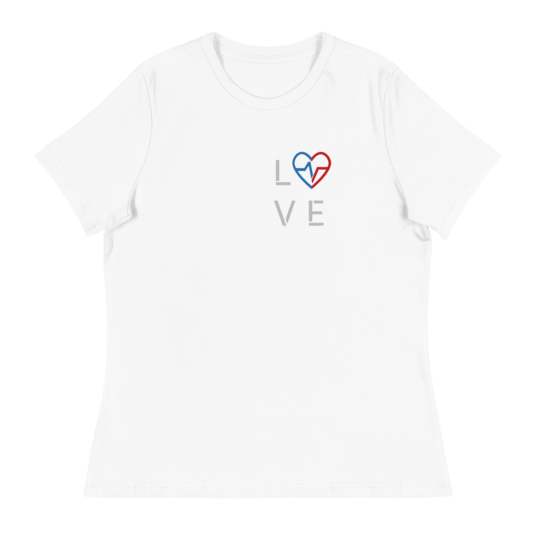 White women’s Love Season tee featuring the red and blue heart emblem on a clean flat lay.